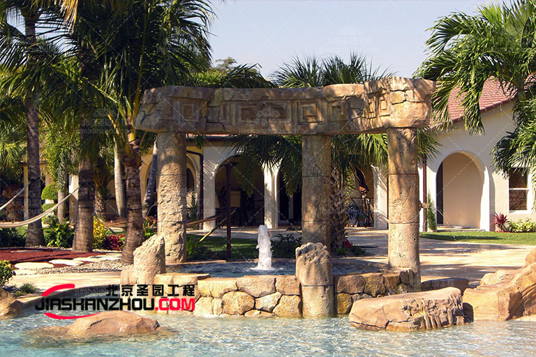 水泥假山與其它裝飾結合,水泥假山與其它裝飾相互結合,用水泥假山來充分的填充其它裝飾下部以及根部,或者用水泥假山襯托搖曳生姿的樹影,它們相融合貫通本來呆板、堅硬的的水泥假山的表面線條在其它裝飾的自然點綴下,越加顯得非常自然愜意。